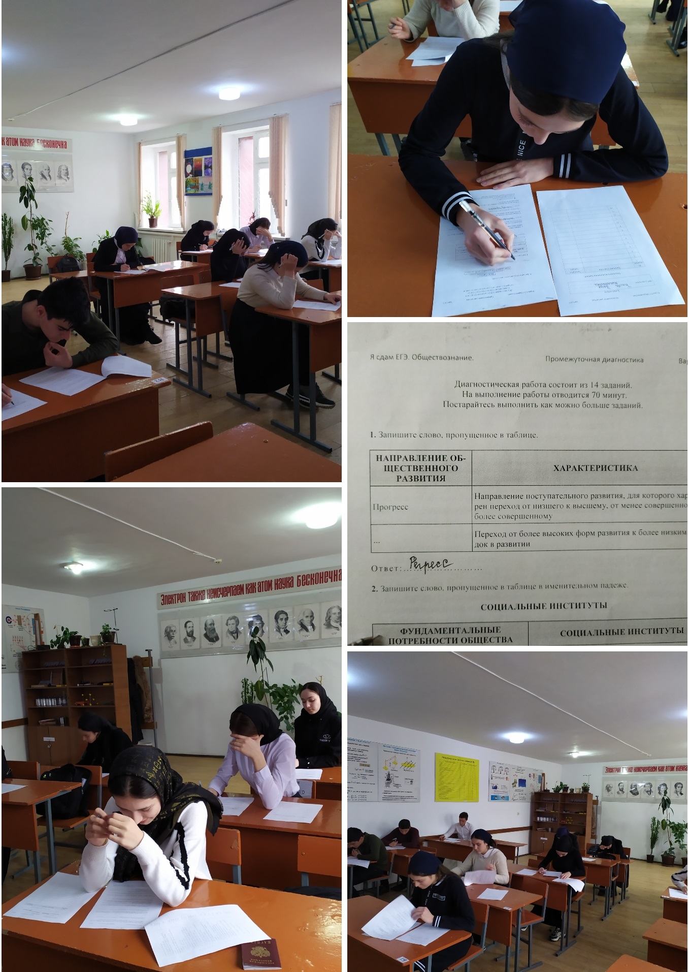 13.12.2019Во исполнение приказа Министерства образования и науки ЧеченскойРеспублики №1348-п «О реализации проекта «Я сдам ЕГЭ. Обществознание»от 30.09.2019 г. сегодня, 13 декабря2019 г., совместно с Центром оценки качества образования, была проведена промежуточная диагностика по разделу «Человек и общество» в выпускном 11 классе