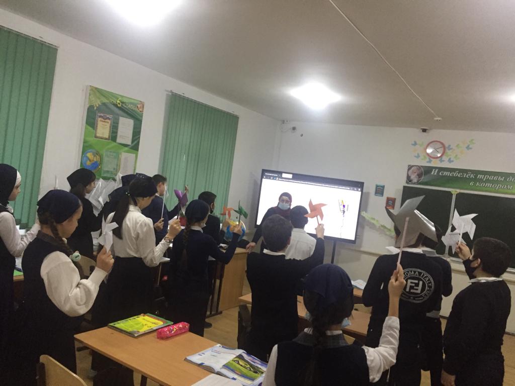 На уроке географии, вместе с учителем Алтамировой Зарган Сайд-Ахмедовной, учащиеся 6 Б класса определяют направление ветра