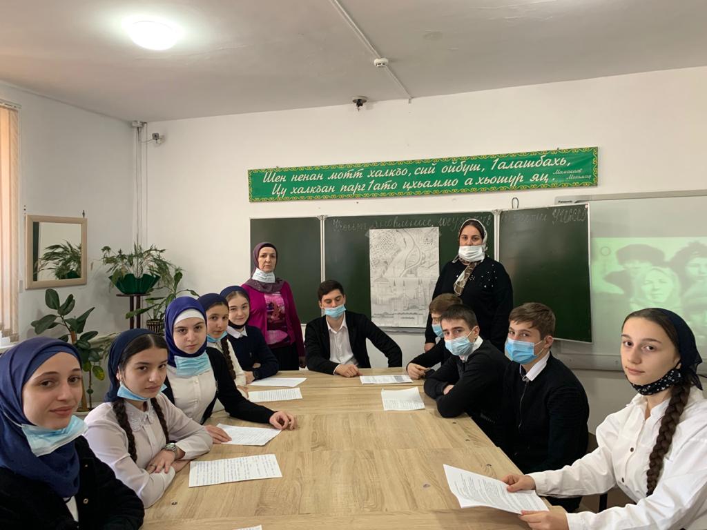 12.01.2021Педагог по ДНВ Мухданова Э.М. и калссный руководитель 10 А класса Бисултанова З.В. провели мероприятие в 10 классе, посвещенное Дню восстановления восстановлению государственности чеченского народа
