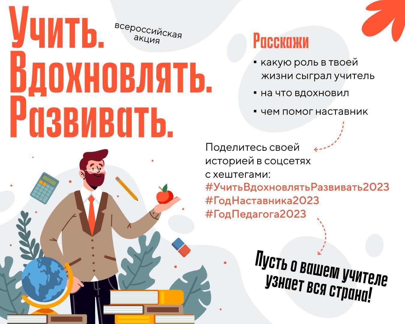 09.03.2023В Год педагога и наставника Минпросвещения России запустило Всероссийскую акцию «Учить. Вдохновлять. Развивать». Мероприятие организовано совместно с компанией VK. В течение года все желающие могут выразить слова благодарности учителям и поделиться своими историями о том, какую важную роль сыграл в их жизни педагог или о том, как они связали свою судьбу с наставничеством и педагогикой. В конце января в рамках акции стартовал новый онлайн-проект «Скажи спасибо педагогу и наставнику», где каждый может написать пожелания учителям в электронной открытке. Чтобы принять участие в акции, нужно на личной странице в социальной сети «ВКонтакте» разместить свой текст, фото или видеоролик по темам: «Наставник/Педагог – это…»; «Благодаря наставнику/педагогу я добился...»; «Как я стал наставником/педагогом». В конце поста следует поставить хештеги #УчитьВдохновлятьРазвивать2023, #ГодНаставника2023 и #ГодПедагога2023. Также любой желающий может создать уникальную открытку с пожеланиями своему учителю, педагогу, наставнику. Для этого нужно зайти на официальную страницу «Скажи спасибо педагогу и наставнику» по ссылке. Выразить слова благодарности, послать онлайн-открытку с пожеланиями и поделиться своей историей можно на протяжении всего Года педагога и наставника. Итоги акции будут подведены 27 декабря 2023 года. В течение года лучшие посты будут опубликованы на медиастене в официальном сообществе Минпросвещения России в социальной сети «ВКонтакте». Акция «Учить. Вдохновлять. Развивать» на примере творческих работ наглядно покажет значимость роли педагога и наставника в воспитании личности, повысит престиж профессии учителя. Для широкой аудитории будут доступны результаты и достижения людей разных сфер деятельности, ставшие возможными благодаря педагогам, воспитателям, тренерам, наставникам. К участию в акции подключается все больше регионов. Недавно к проекту присоединились педагоги из Красноярского края. Они рассказали, какую роль в их жизни и профессии сыграли наставники, и поблагодарили своих учителей.