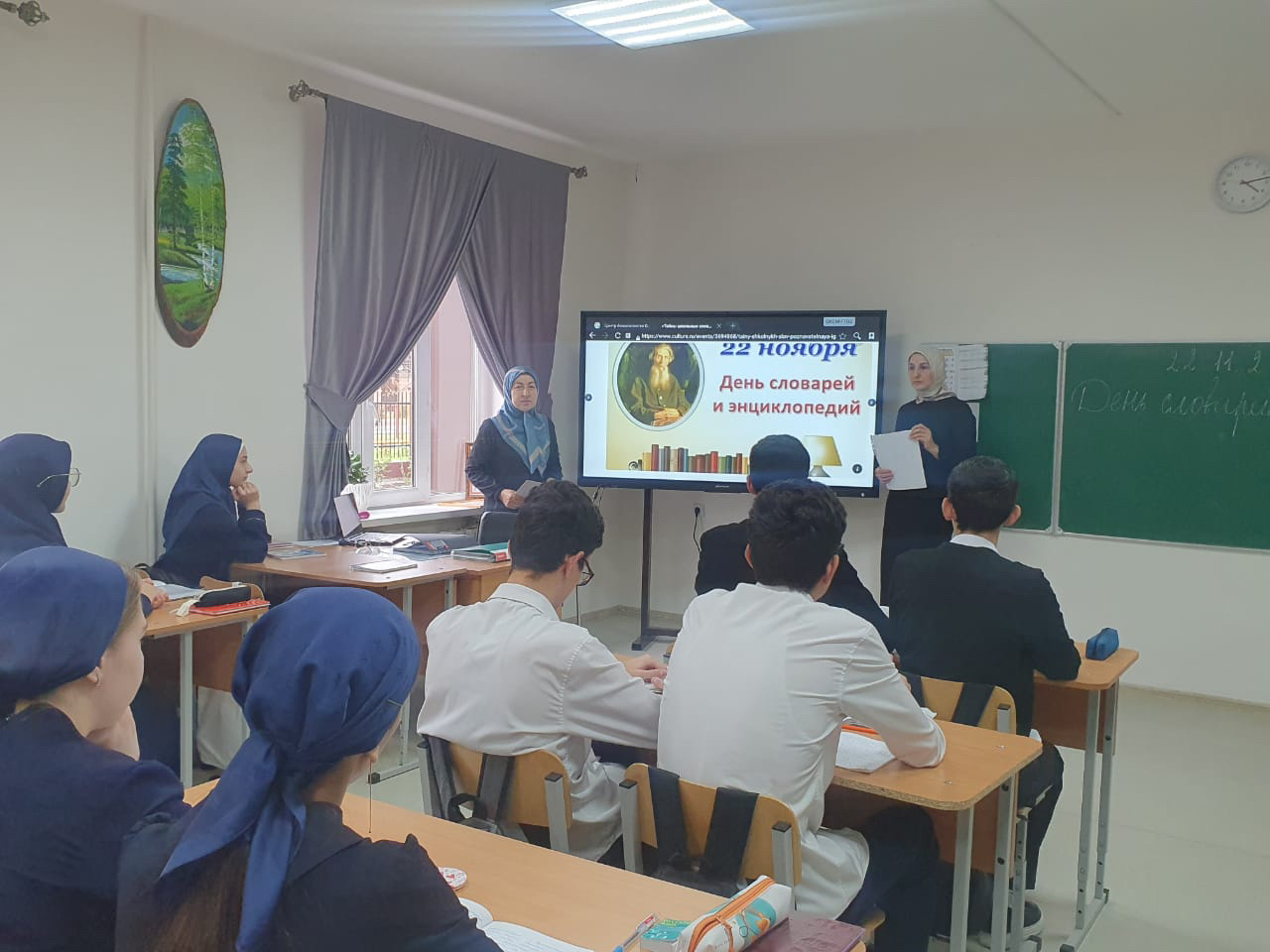педагогом-библиотекарем Раисовой Х. С. совместно с учителем русского языка и литературы Бажаевой З. С-А. была проведена интерактивная игра ко Дню словаря и юбилею В. И. Даля "Тайны школьных слов" в 9-11 кл. Целью мероприятия было расширение знаний обучающихся об основных словарях русского языка и формирование умений их использования. О вкладе В. И. Даля в культуру русского народа.