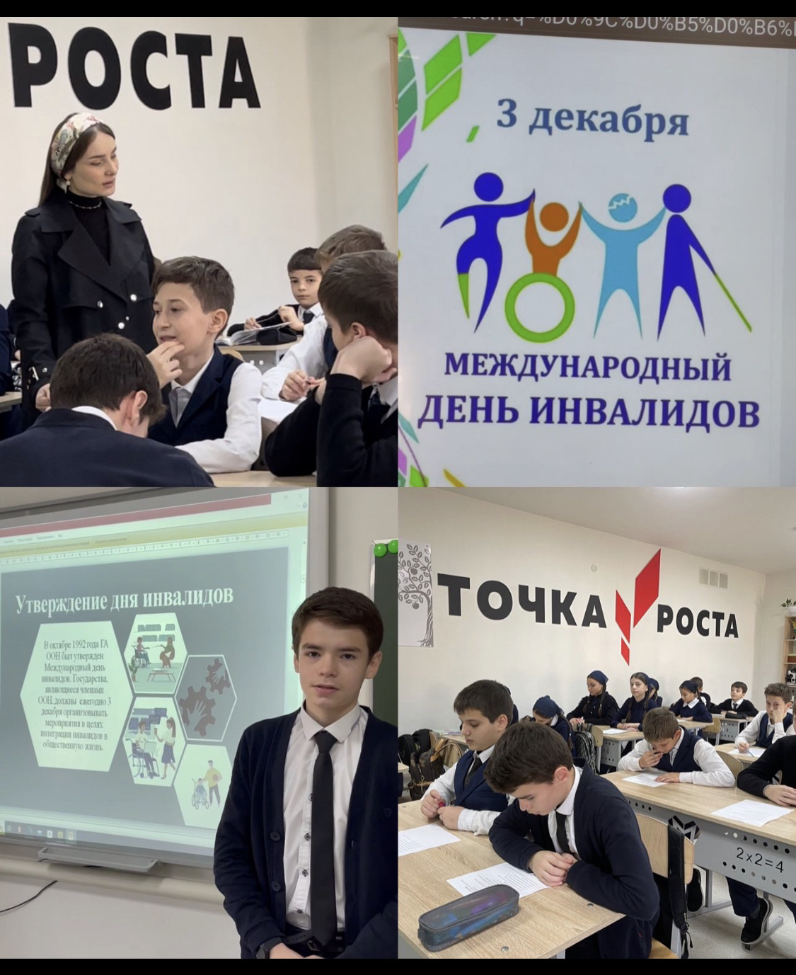 4 декабря 2023 года в МБОУ "СОШ Педагог-психолог Зулихан Тутханова провела занятия в 9х и 6х классах на тему: «Международный День инвалидов». Специалист донесла до детей, что такие люди ничем не отличаются от здоровых, просто они немного особенные. К сожалению, не все люди умеют одинаково хорошо ходить или видеть, или слышать, или понимать. Нарушения в здоровье ограничивает их тело в определенных действиях и способностях, но в остальном люди с инвалидностью такие же отличные ребята, как и мы с тобой. Общаться с ними можно и нужно. Занятия очень понравились ребятам, и после их окончания комментарии и предложения по поддержке людей с особенностями не переставали поступать.