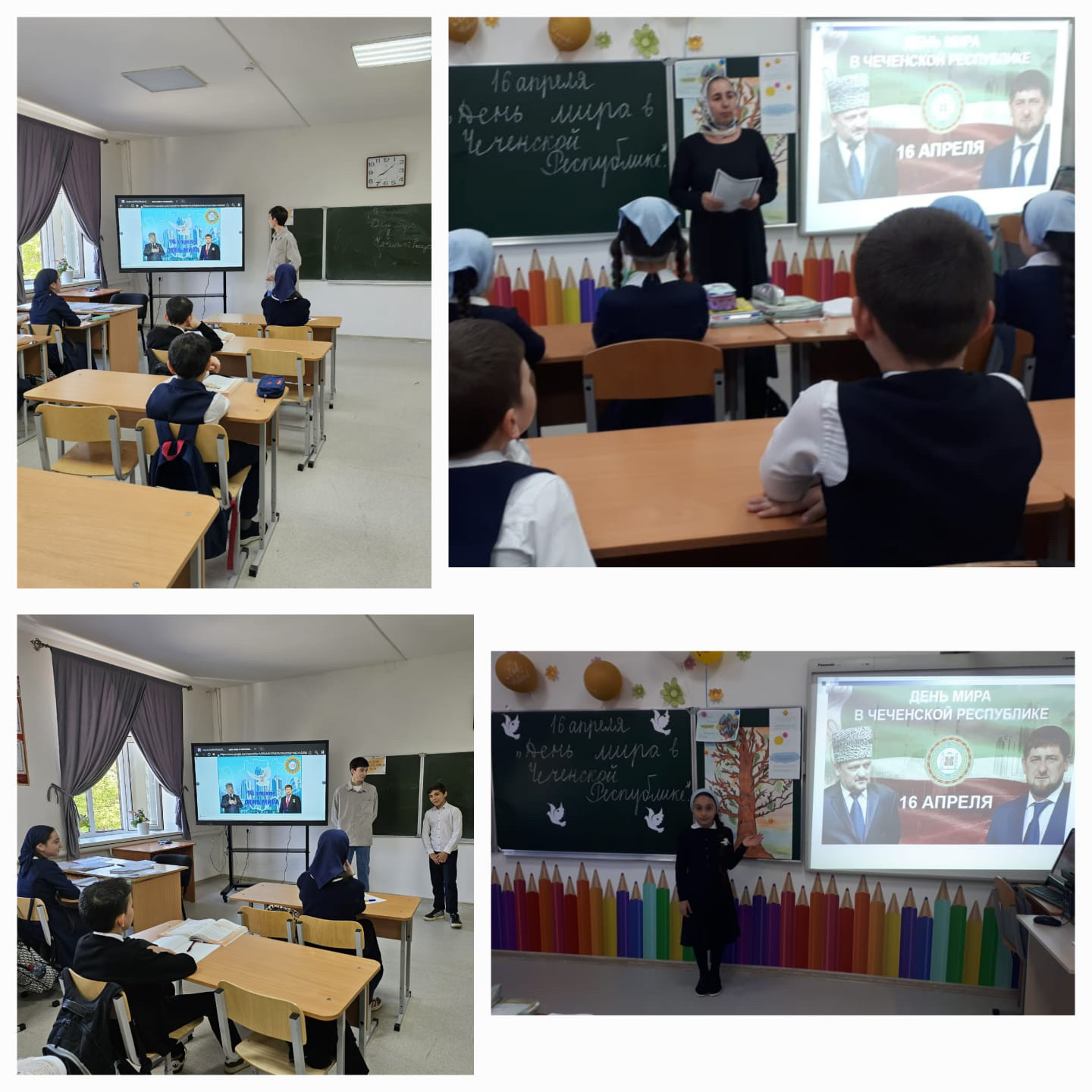 В МБОУ «СОШ № 1 г. Ачхой-Мартан» были проведены уроки, посвященные Дню Мира в Чеченской Республике. Урок направлен на воспитание патриотизма, любви к Родине, ответственного отношения за свои поступки. Классные руководители рассказали, как об этом дне мечтал и отдал за него свою жизнь первый Президент Чеченской Республики, Герой России Ахмат-Хаджи Кадыров. Глава Республики Рамзан Кадыров довел начатое своим отцом дело до конца. И именно этот день, как одно из событий величайшей значимости в истории Чеченского народа, стал праздником. «Отныне и навсегда День мира на чеченской земле» –сказал об этой дате Глава Чеченской Республики Рамзан Кадыров.