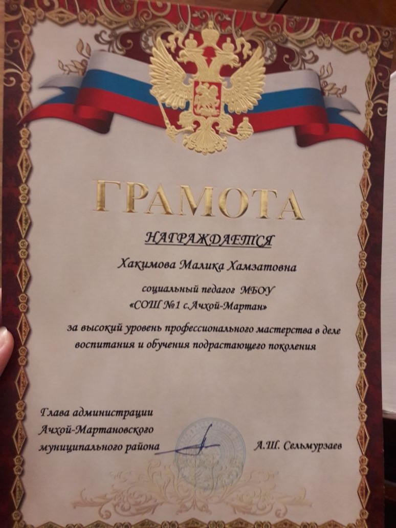 28.09.2017 год. Социальному педагогу нашей школы Хакимовой М.Х. была вручена грамота от главы администрации Ачхой-Мартановского района Сельмурзаева А.Ш.