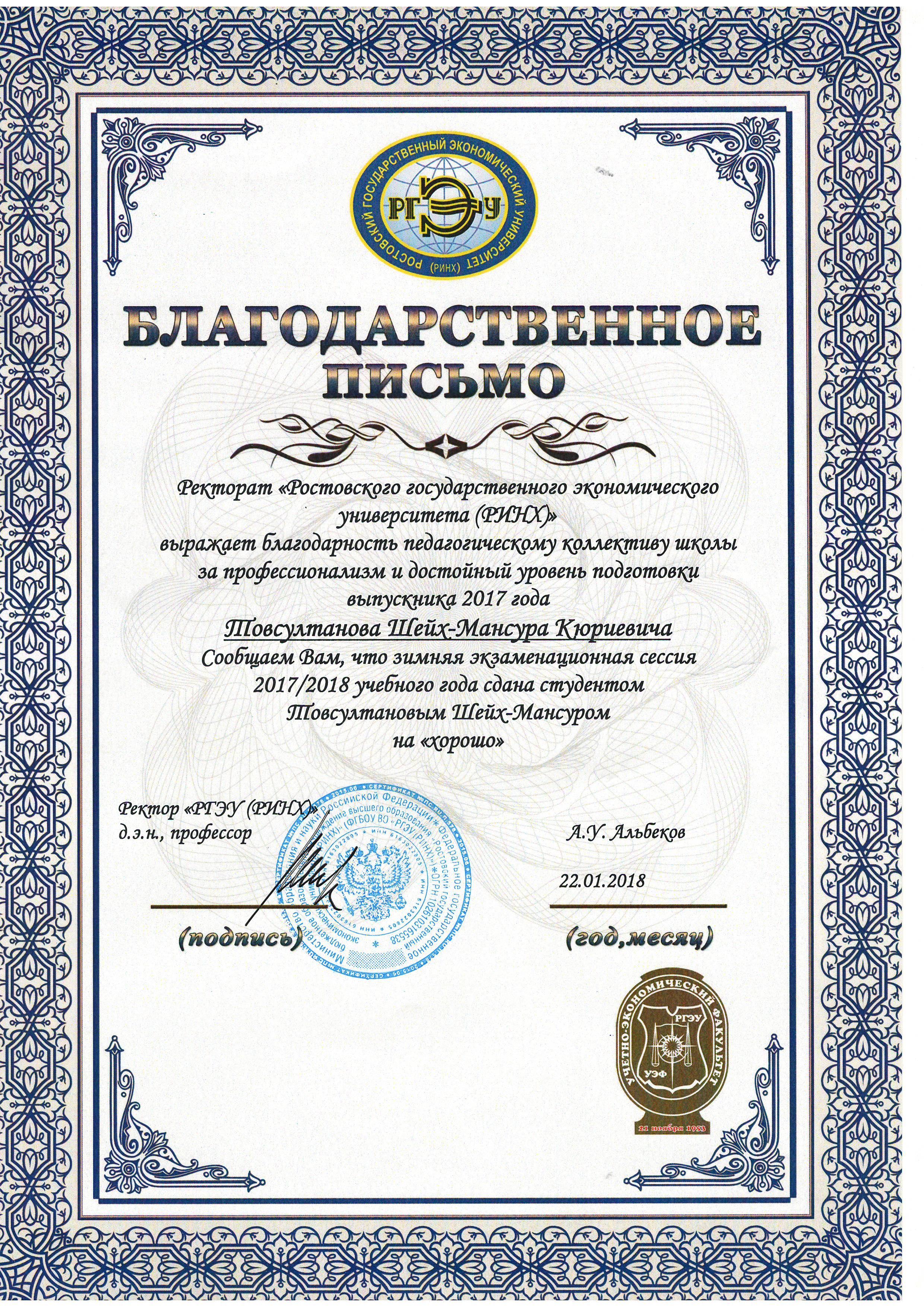 02.03.2018В адрес школы поступило благодарственное письмо на выпускника нашей школы Товсултанова Шейх-Мансура из ректората Ростовского государственного экономического университета. Желаем дальнейших успехов Шейх-Мансуру и всем выпускникам! Дала аьтто бойла шун!