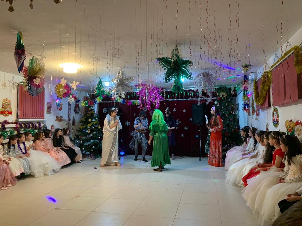 25 декабря учащимися 11а кл. (под руководством зам. дир. по ВР Мадаевой и педагога-организатора БисултановойЗ.В.) было подготовлено развлекательное мероприятие, который прошел в актовом зале школы. Новогоднее представление отличилось ярким сценарным ходом, мастерством исполнителей и активным привлечением ребят. Простота и незамысловатость исполнения ролей была оправдана живой манерой актерской игры ведущих, красочными костюмами сказочных героев, быстрой сменой подвижных, массовых игр. Каждый класс подготовил оригинальные художественные номера на новогоднюю тематику (пели, танцевали, показывали сценки, сняли видеопоздравления). Зам. директора по воспитательной части подвела итоги стенгазет и костюмов.